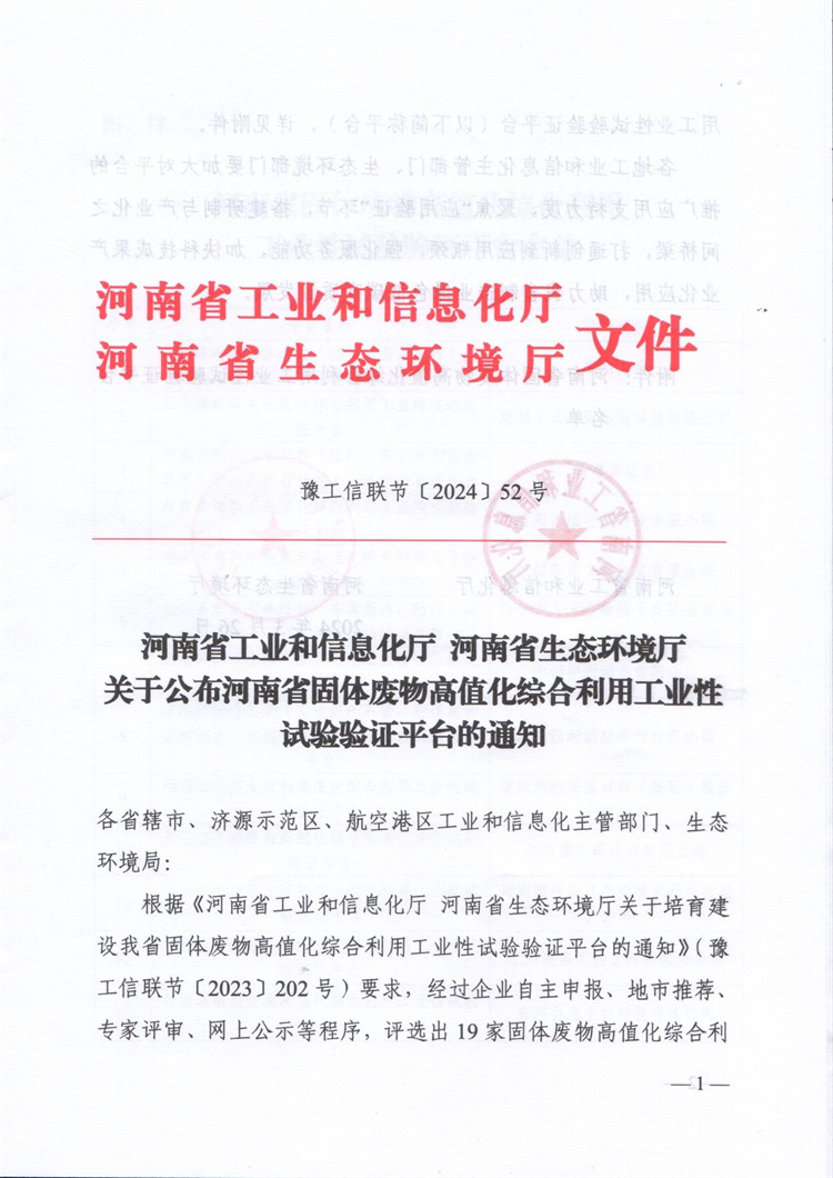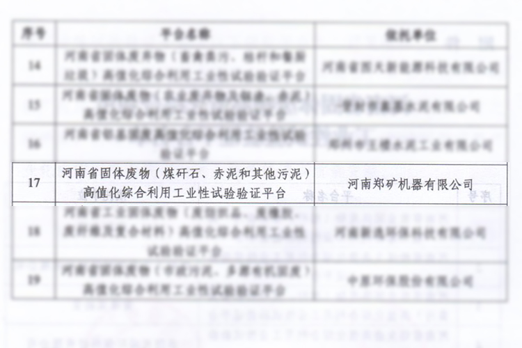 恭喜河南鄭礦機器有限公司被河南省工業和信息化廳、河南省生態環境廳評定為河南省固體廢物高值化綜合利用工業性試驗驗證平臺的。